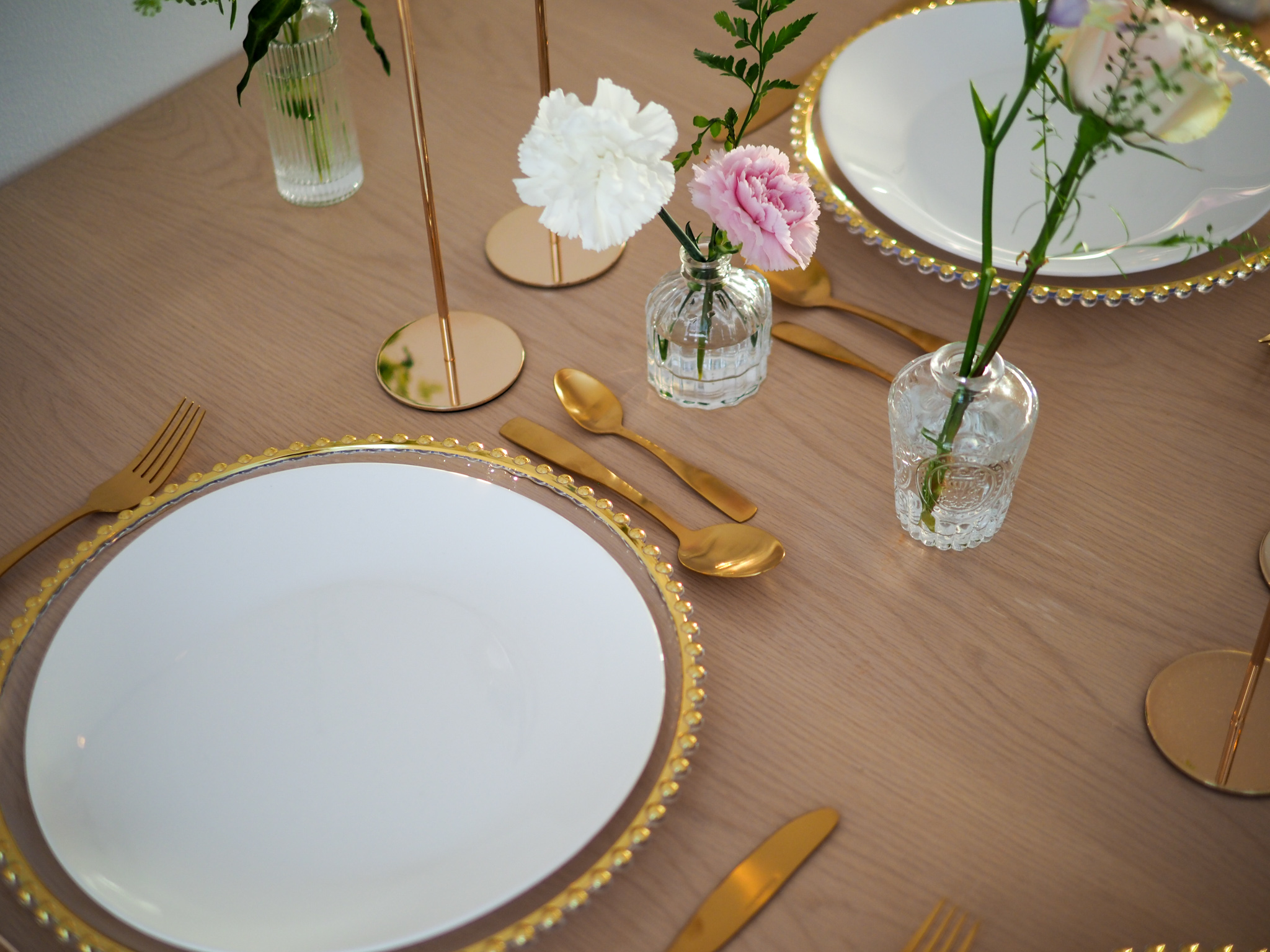 Shampanjakultaiset aterimet. Vuokraushinta yksinkertaiselle aterinsetille (haarukka, veitsi, ruoka- & jälkiruokalusikka).